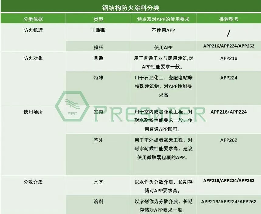 除了防火机理,钢结构防火涂料还可以进行其它分类,而且不同的分类对聚磷酸铵有有各自的要求,如耐水、耐候、存储稳定性等。因此,聚磷酸铵的性能也不断的优化,不仅仅在于合成过程中的参数配置,后期的改性处理也显得尤为重要。