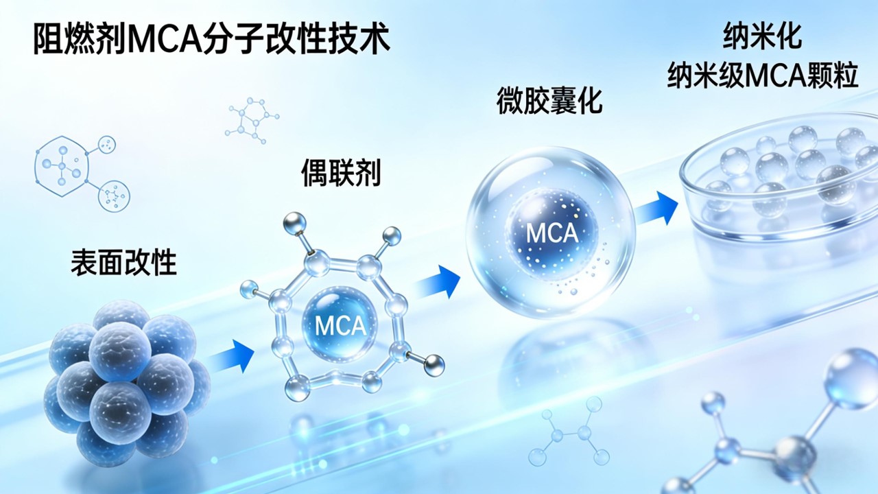 为了解决这个问题,行业内早已祭出“改性三板斧”。最常用的是表面改性技术,通过硅烷偶联剂在MCA颗粒表面“穿外衣”,破坏氢键网络,让它从“抱团者”变成“独行侠”;微胶囊化技术则是给MCA裹上一层高分子薄膜,既防止团聚,又能控制其在高温下的释放节奏;纳米化技术更是将MCA颗粒做到纳米级别,从根本上提升分散均匀性,不过这两种工艺都面临着成本较高、规模化生产难度大的问题。
