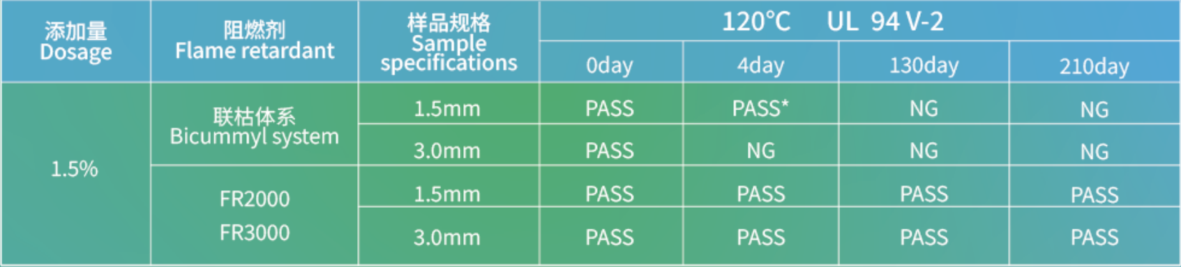 低卤环保阻燃剂NitrophorTM FR系列是通过氮、磷、溴协效作用达到UL 94 V-2阻燃级别。具有极高的阻燃效率,发烟量小,不含也无需添加Sb203作为协效剂,符合 IEC 61249-2-21 的无卤要求。其中,FR1000 属于传统联枯体系,拥有阻燃效率高,分散性能好的特点,推荐应用于电子电器产品。FR2000 及 FR3000 属于聚联枯体系,具有耐热氧老化性能优异,抗析出性能好的特点,推荐应用于电子电器、新能源汽车、挤出板材及卫浴制件等产品领域。